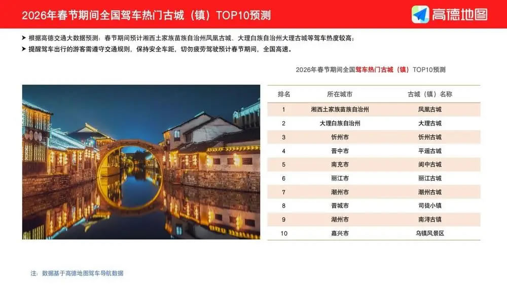 除了傳統的返鄉團圓,今年的“旅行過年”也呈現出鮮明的主題化特征。報告預測,廣州、重慶、成都、北京、杭州等將成為十大熱門自駕游城市,而在目的地選擇上,則呈現出三大熱門主題: