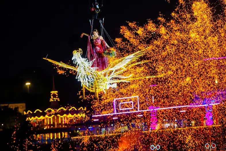 重慶歡樂谷舉行了新春大妙會活動,集水陸空立體非遺大秀、百場非遺演藝、多種民俗互動、年味萬福市集等于一體,以傳統與現代碰撞的獨特魅力為游客奉上沉浸式的地道年味體驗。其中,非遺大秀在夜幕中璀璨亮相,1600℃的鐵水揮灑成漫天花火,演員化身“天女”撒下花瓣雨,湖面的龍船、火鳳凰、風火輪等裝置火光綻放,光影成趣,水陸空一體聯動,驚艷絕倫;川劇變臉、潮汕英歌舞、福建游神、電音三太子等百場非遺演藝,讓游客可一站式領略全國傳統文化魅力,吸引絡繹不絕的游客前往。