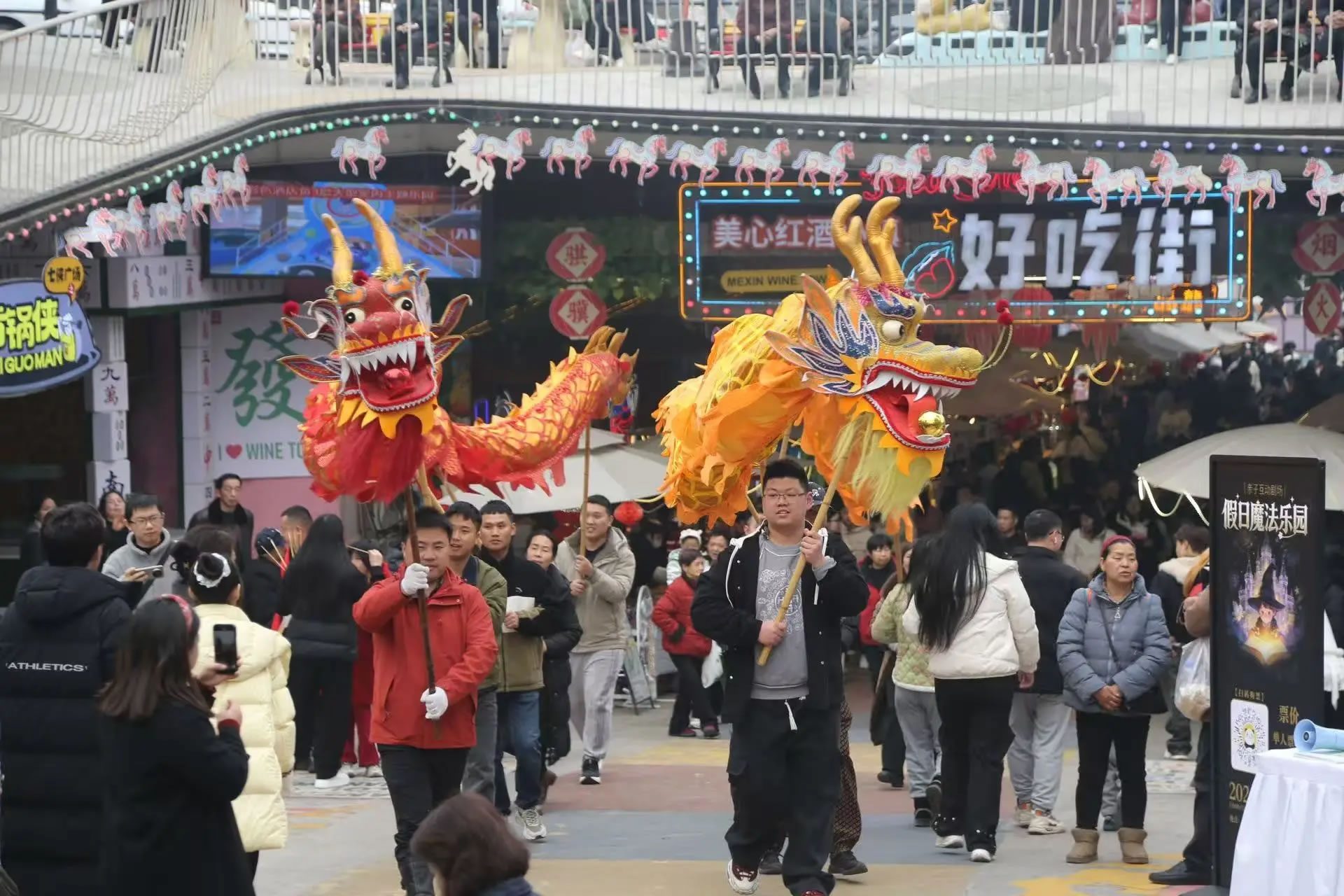 涪陵美心紅酒小鎮景區更是打破傳統景區“臺上表演、臺下觀看”的模式,全面轉向以游客為主導,全民參與、沉浸式互動的新春玩法,把游客真正“寵”進濃濃年味里。除了舞龍舞獅、民俗巡游、財神送福等經典項目外,游客還可以穿戲服、持龍具、跟著鼓點一起巡游,親身感受傳統年俗的熱鬧與儀式感,從“圍觀者”變身“參與者”,讓年味更足、歡樂加倍。15日至17日,景區人氣持續火爆,日均接待游客超6萬人次,成為重慶近郊新春出游的熱門之選。