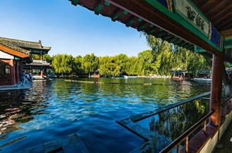 一入園內,徜徉其中,步移景異,引人入勝。名泉水景區是整個園林的要素,它以明水湖為中心抒發詩情畫意。峻石之上,陡起一閣,名匯泉閣,登閣俯瞰,可觀整個園林;極目遠眺,明水的現代神韻一覽無余。閣下湖邊,建有“濯纓”和“漪漪”兩亭,可休憩亭下,賞泉水濱。飛架水上的兩座大理石拱橋,將湖劃分為三面。南湖小巧空溟;北湖波平浪細;西湖水深流急。蕩舟湖心,水色天光,相映成輝,令人心曠神怡。明水湖中,諸泉相連,園門口有“泉”,泉水汨汨,奔突向上;匯泉閣后有“龍灣泉”,泉水涌動,波光粼粼;龍泉寺西有“金鏡泉”,泉水如鏡,閃鑠晶瑩。而聞名遐邇的“百脈泉”在梵王宮殿下,由南北兩組涌泉匯成,中架拱橋相通,池內涌珠浮翠,出神入化,堪稱天下奇觀。龍泉寺雄踞在百脈泉北岸,為濟南地區著名佛寺,始建于明景泰元年(公元1450年),現僅存大殿梵王宮。殿內,佛像金碧輝煌,壁畫形象生動。佇立梵王宮前,云蒸霞蔚的湖光山色盡收眼底。位于百脈泉與園西北處的清照園,占地18000平方米,為紀念絕代女詞人李清照而興建,建筑有吟風榭、碑廊、漱玉堂、燕寢凝香、金石苑、易安樓,園內碧瓦飛甍,樓軒巍巍,秀竹翠柏,流水淙淙,鑲嵌林列著全國知名書法家的書法碑刻,琳瑯滿目,風格迥異,美不勝收,是一座集中國南北園林風格于一體的園中之園。