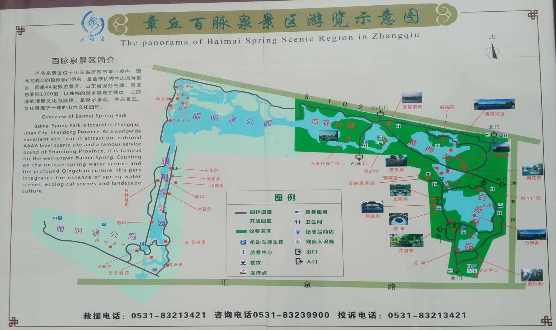 公園布局由著名園林專家孫筱祥先生設計,園名由已故著名書法大師舒同題寫。園內噴泉5處,石拱橋3座,石土假山2座,石、木板平橋、各一架。并建有匯泉閣、湖心亭、船塢碼頭等。公園景點布局因地緣勢,順水流向,逐次展開,設計獨特,構思巧妙。全園分為泉水、花園、幽靜學習、林蔭散步、兒童樂園5個區。泉水區:奇花異草,千姿百態、鳥語花香,競相斗艷。幽靜學習區:環境幽雅,空氣清新,掩卷吟歌,浮想聯翩。密林散步區:小橋流水,蜿蜒曲折,灌木叢生,暗柳成蔭。兒童樂園區:游龍戲水,木馬滑梯,蕩秋千,跳蹦蹦床,高架橋,星空穿梭游藝機,樂不思歸。公園內樓、臺、亭、榭、閣,點綴其間,錯落有致,相互輝映。假山、密林、湖水、斷橋,別有洞天,可謂“疑是山窮水無路,柳暗花明又一景”。濟南七十二名泉中的百脈泉乃園中勝景,公園也因之得名。1997年5月,又在園西北隅建成清照罷工(李清照紀念館),公園風光無限,更添春色。百脈泉公園是鑲嵌在章丘大地上的一顆明珠。百脈泉公園,位于山東省濟南市章丘區明水境內,這里是龍山文化的發祥地,一代詞宗李清照的故里。