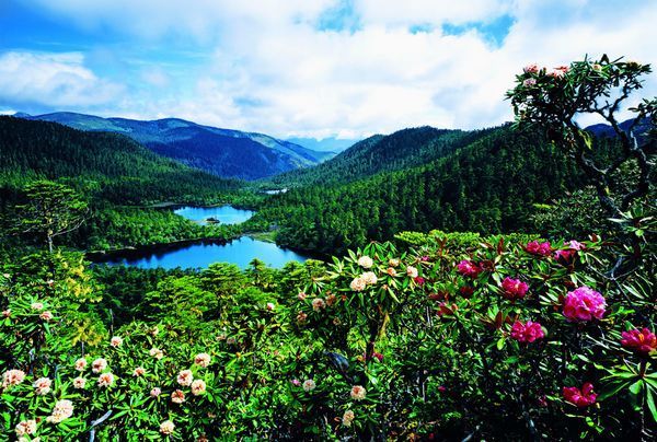 老君山風景區山中的確有九十九個冰蝕湖,而且每個湖又呈現出不同的色彩和姿態,與童話般的“九寨溝”相比,它更多了一分大氣、少了一分矯情。特別在每年的5、6月,漫山的花在純凈得幾乎透明的天空下開放了,遠遠看去,就像是一張五彩的草甸。