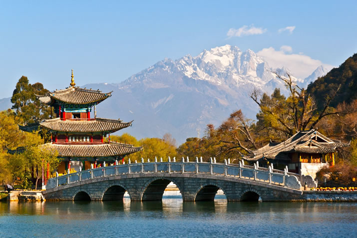 黑龍潭位于麗江古城北端象山之麓,從古城四方街沿經緯縱橫的玉河溯流而上,約行一千米有一處晶瑩清澈的泉潭,即為中外聞名的黑龍潭。黑龍潭不僅是麗江古城的活水源頭,也是古城區的旅游景點。潭內隨勢錯落的古建筑有龍神祠、得月樓、鎖翠橋、玉皇閣和后來遷建于此的原明代芝山福國寺解脫林門樓、五鳳樓,原知府衙署的明代光碧樓及清代聽鸝榭、一文亭、文明坊等建筑。位于黑龍潭中央的得月樓上,懸掛有郭沫若先生親筆題寫的楹聯:“龍潭倒映十三峰,潛龍在天,飛龍在地;玉水縱橫半里許,墨玉為體,蒼玉為神”。黑龍潭曾被列入《中國名泉》《中國風景名勝》等書。