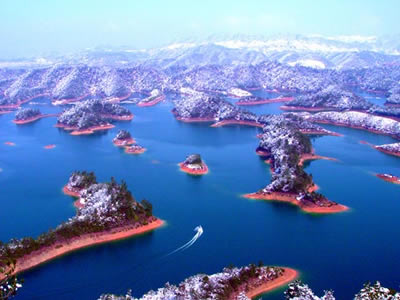 千島湖,是一個美麗的湖 。湖中那1078個島嶼,姿態各異,風姿綽約。春游湖上,布滿山花的島嶼,是一個個天真爛漫的村姑;夏日游湖,人們多想在這碧波中逐浪暢游;秋山紅葉,使人想起"霜葉紅于二月花"的詩句,雪滿湖山,松挺山崖,又是一幅王維筆下的詩畫圖。